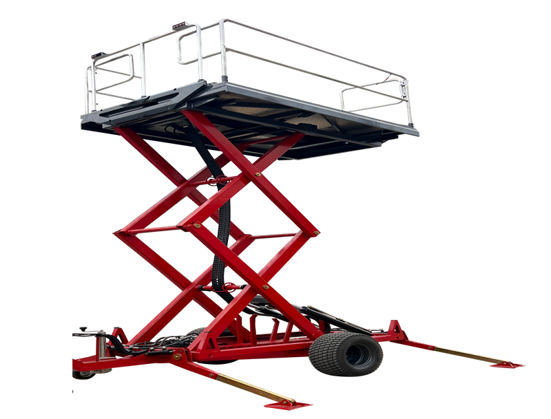 升降拖车平台,通过动力机械牵引进行行走,电磁阀液压控制,通过液压进行平台的升降和两侧的打开,升降拖车的平台高度和宽度根据需求自我调整,四个液压支撑腿支撑地面,作业时更稳固安全,牵引式架构和支撑轮设计,使拖车平台的装卸更加方便快捷。